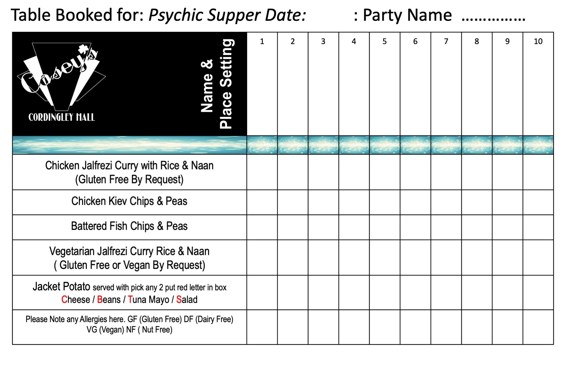 All seats will be reserved so if you need to sit with someone else who has booked separately please let us know. We also will send you the menus in advance for you to PRE BOOK your food choices.